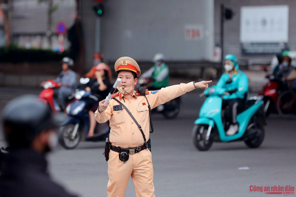 Người dân di chuyển trên đường với tốc độ chậm trong sự hướng dẫn của lực lượng Công an.
