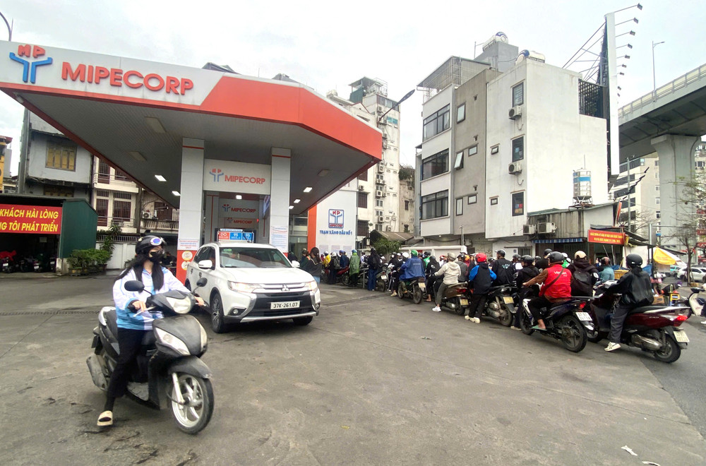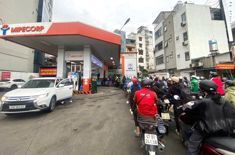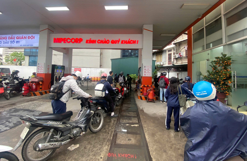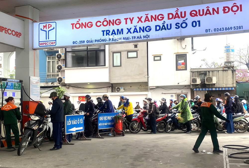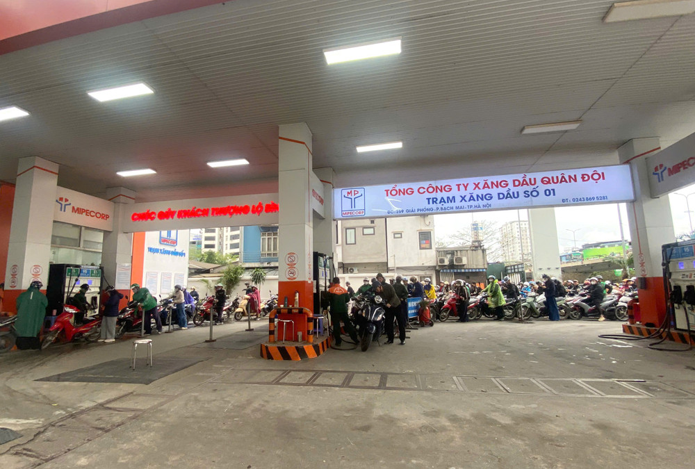 Khoảng 16h ngày 9/3, rất nhiều phương tiện nối đuôi nhau chờ tới lượt đổ xăng tại cùng ngày, tại Trạm xăng dầu số 1 - Tổng Công ty Xăng dầu Quân đội (phường Bạch Mai, TP Hà Nội)