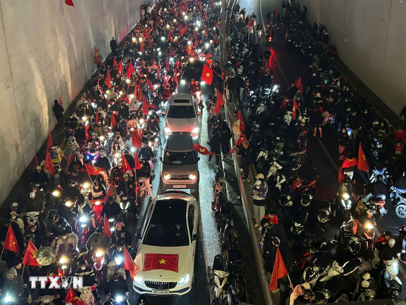 Khu vực hầm Kim Liên đông nghịt người ăn mừng chiến thắng của U23 Việt Nam. (Ảnh: Quốc Khánh/TTXVN)