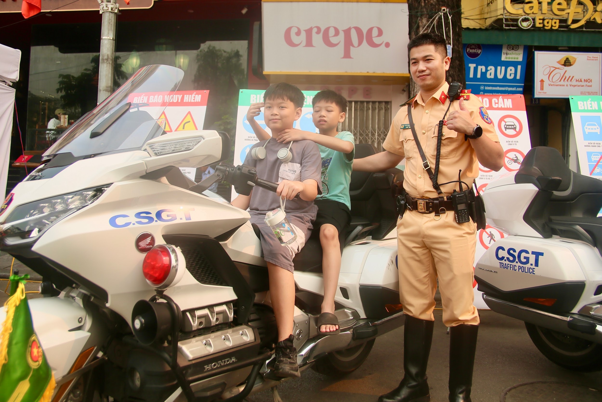 Hào hứng nhất là các em học sinh, khi được trực tiếp ngồi trên những chiếc xe chuyên dụng của CSGT