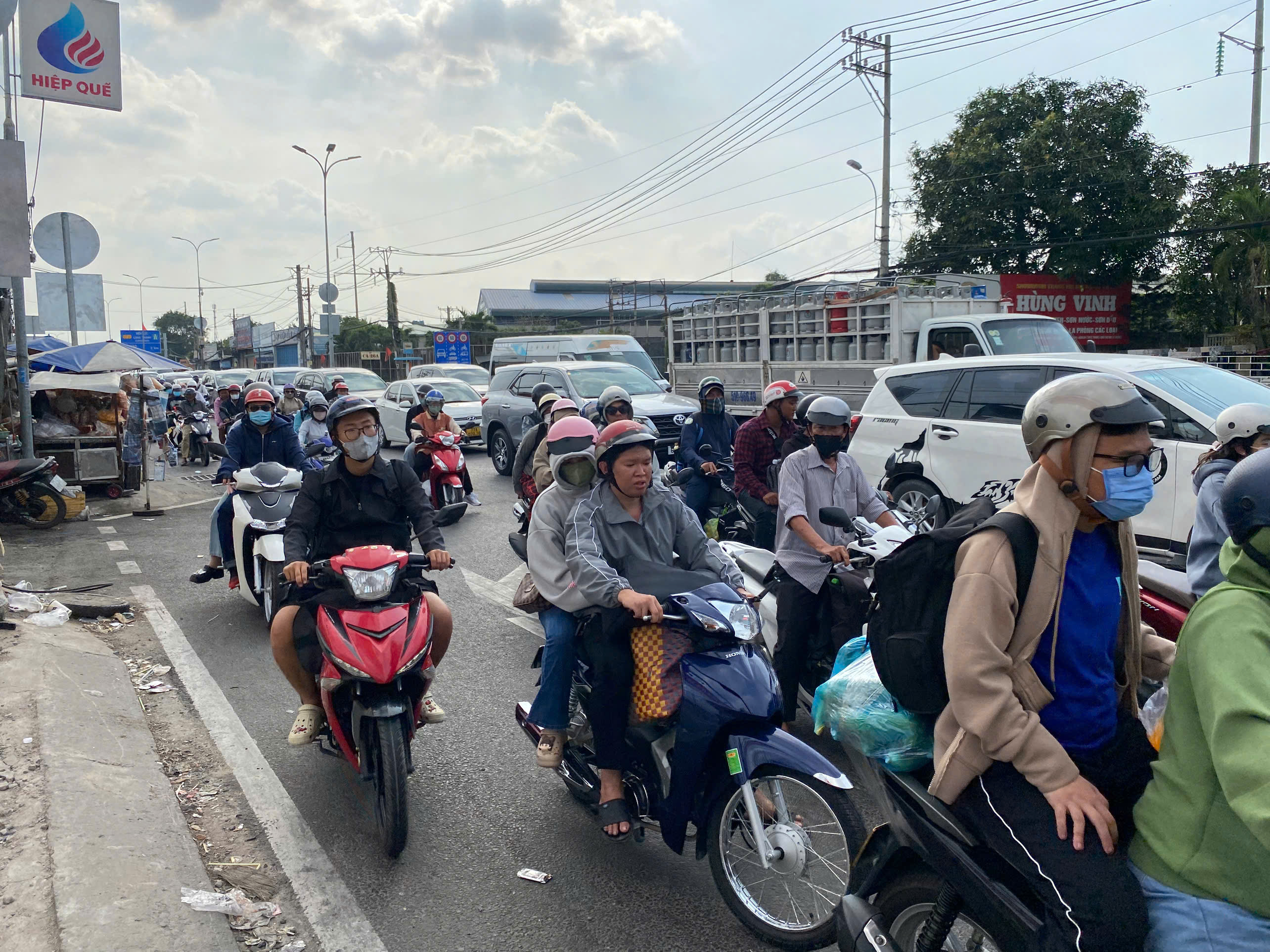 Tại đoạn qua xã Bình Chánh, dòng xe gắn máy nối đuôi nhau di chuyển chậm khi đến các giao lộ lớn. Tuy nhiên, do lượng người về lại thành phố trải dài theo nhiều khung giờ trong ngày nên không xảy ra ùn ứ như đợt trước tết.