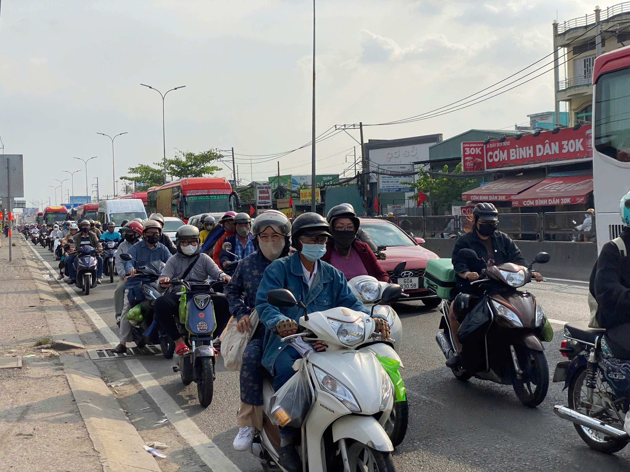 Ghi nhận tại cửa ngõ phía Tây TPHCM, trên quốc lộ 1 (đường Lê Khả Phiêu), từ khoảng 11 giờ trưa, lưu lượng phương tiện bắt đầu tăng mạnh. Từng đoàn xe máy chở theo hành lý lỉnh kỉnh nối đuôi nhau hướng về trung tâm thành phố.