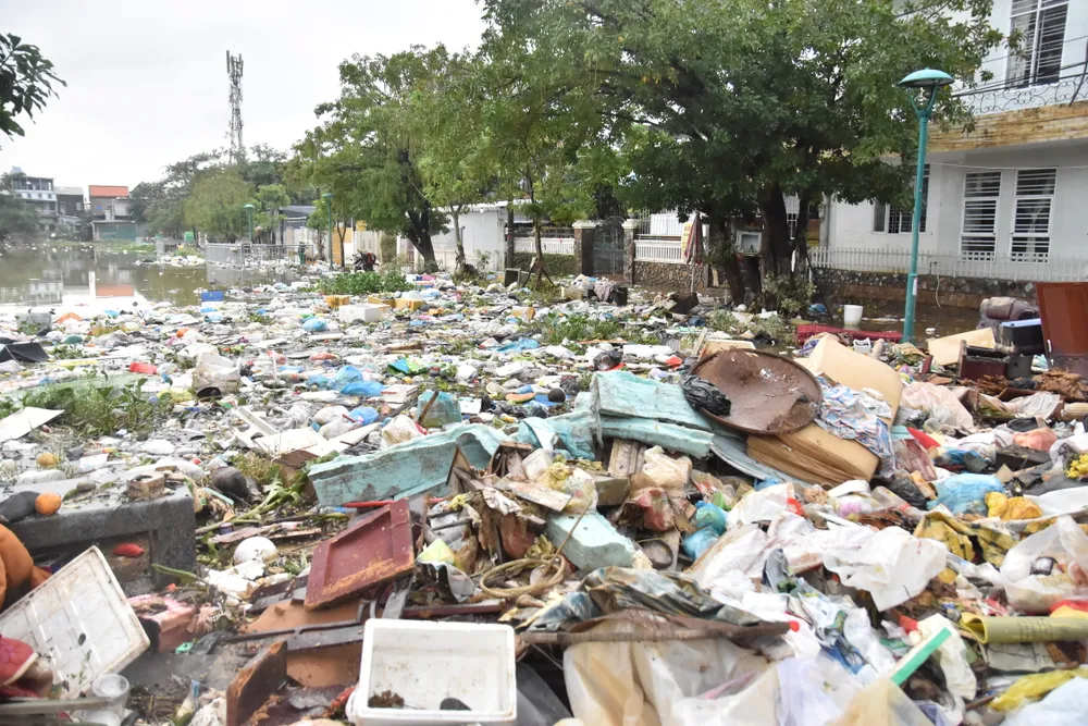 Đến sáng 1-11, nhiều nơi tại TP Huế vẫn bị bao vây bởi rác thải, bùn đất sau trận lũ lớn. Ảnh: NGUYỄN DO