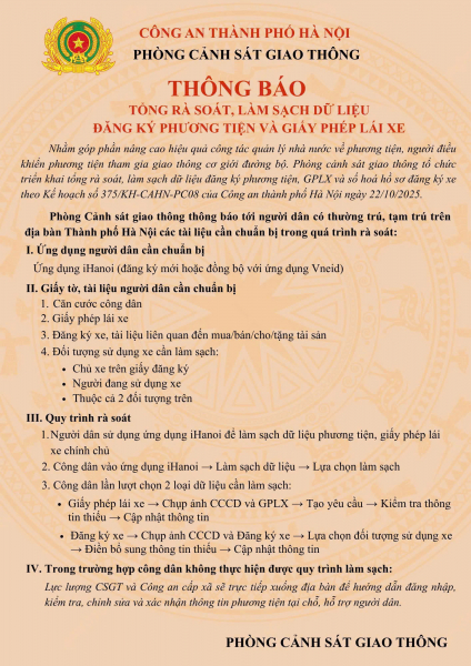 Kế hoạch cao điểm được triển khai theo hai giai đoạn: Giai đoạn 1, đẩy mạnh tuyên truyền, vận động người dân tự kê khai thông tin phương tiện, chủ phương tiện trên ứng dụng iHanoi; Công an cấp xã tiến hành rà soát, hướng dẫn các trường hợp chưa khai báo. Giai đoạn 2, các đơn vị chuyên môn sẽ cập nhật, đồng bộ dữ liệu lên hệ thống đăng ký xe và giấy phép lái xe, góp phần hoàn thiện cơ sở dữ liệu dùng chung, phục vụ công tác quản lý nhà nước và chuyển đổi số toàn diện trong lĩnh vực giao thông.
