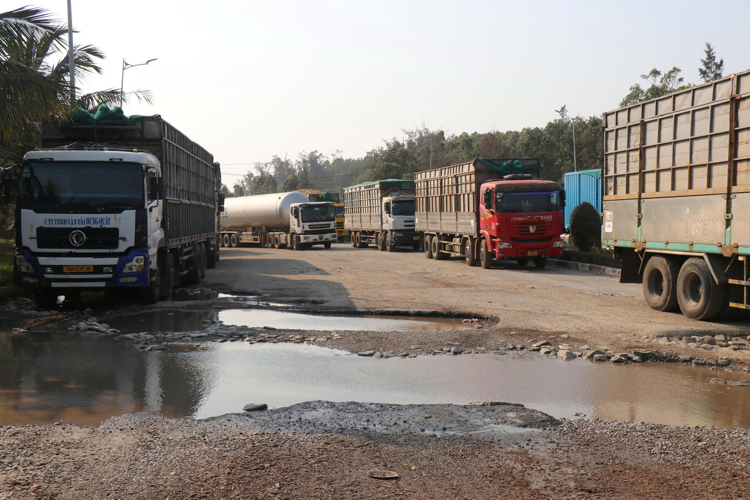 Bên cạnh lượng lớn dăm gỗ rơi vãi, nền đường QL24C đoạn qua xã Vạn Tường cũng nát bươm.