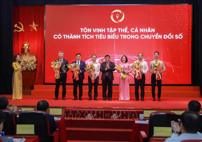 Phó Thủ tướng Chính phủ Nguyễn Chí Dũng tặng hoa và kỷ niệm chương cho tập thể, cá nhân có thành tích tiêu biểu trong chuyển đổi số. Ảnh: Phan Phương/TTXVN
