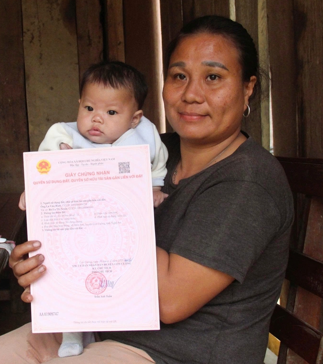 Chị Lê Thị Hoa (SN 1988, bản Búng) cùng bìa hồng nhà ở được Nhà nước cấp