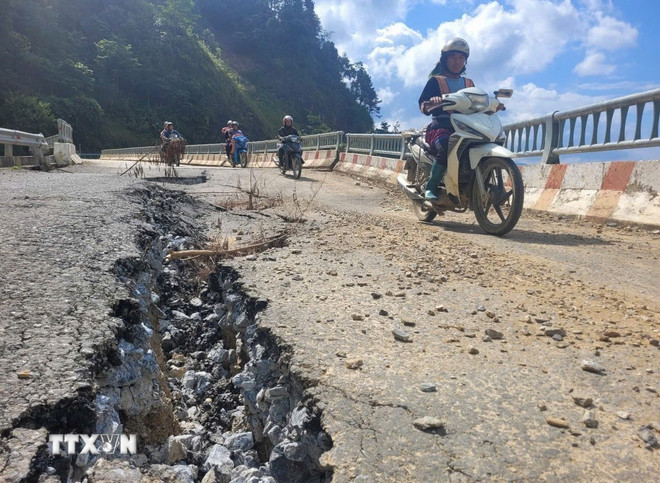 Nhiều mối cầu đã hở khe lớn, vết nứt xuất hiện dài ở cầu cạn tại Km10 + 300 trên tuyến ĐT 128. (Ảnh: Nguyễn Oanh/TTXVN).