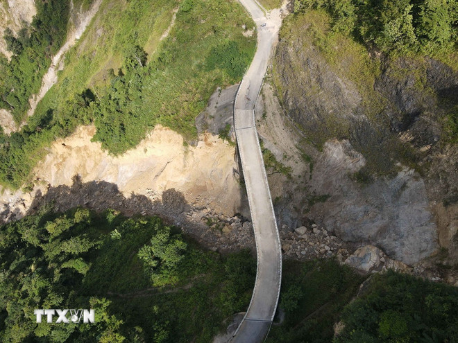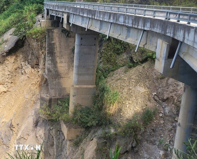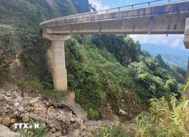 Cầu cạn tại Km10 + 300 trên tuyến ĐT128 kết nối trung tâm xã Sìn Hồ, Tủa Sín Chải với Quốc lộ 12 của tỉnh Lai Châu sạt lở nghiêm trọng. (Ảnh: Nguyễn Oanh/TTXVN)