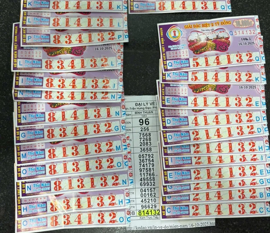 Anh TVH cũng cho biết, 14 tờ trúng giải đặc biệt mỗi vé 2 tỉ đồng của Công ty Xổ số kiến thiết Bình Thuận phát hành ngày 16-10, ký hiệu 10K3 có dãy số 814132, người trúng ở Sông Lũy, Bắc Bình, Bình Thuận (cũ).