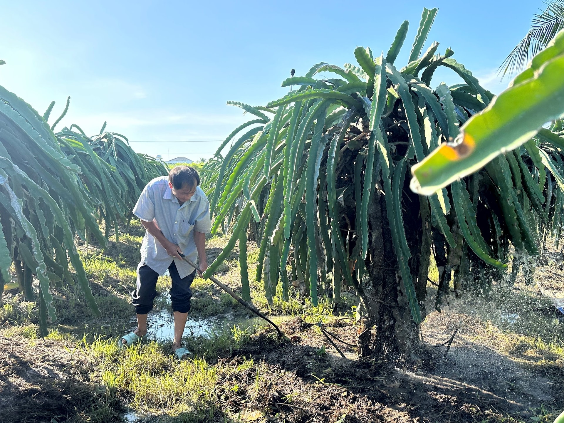 Nông dân phường Hàm Thắng ra thăm đồng, tìm cách khôi phục cây thanh long sau khi lũ rút