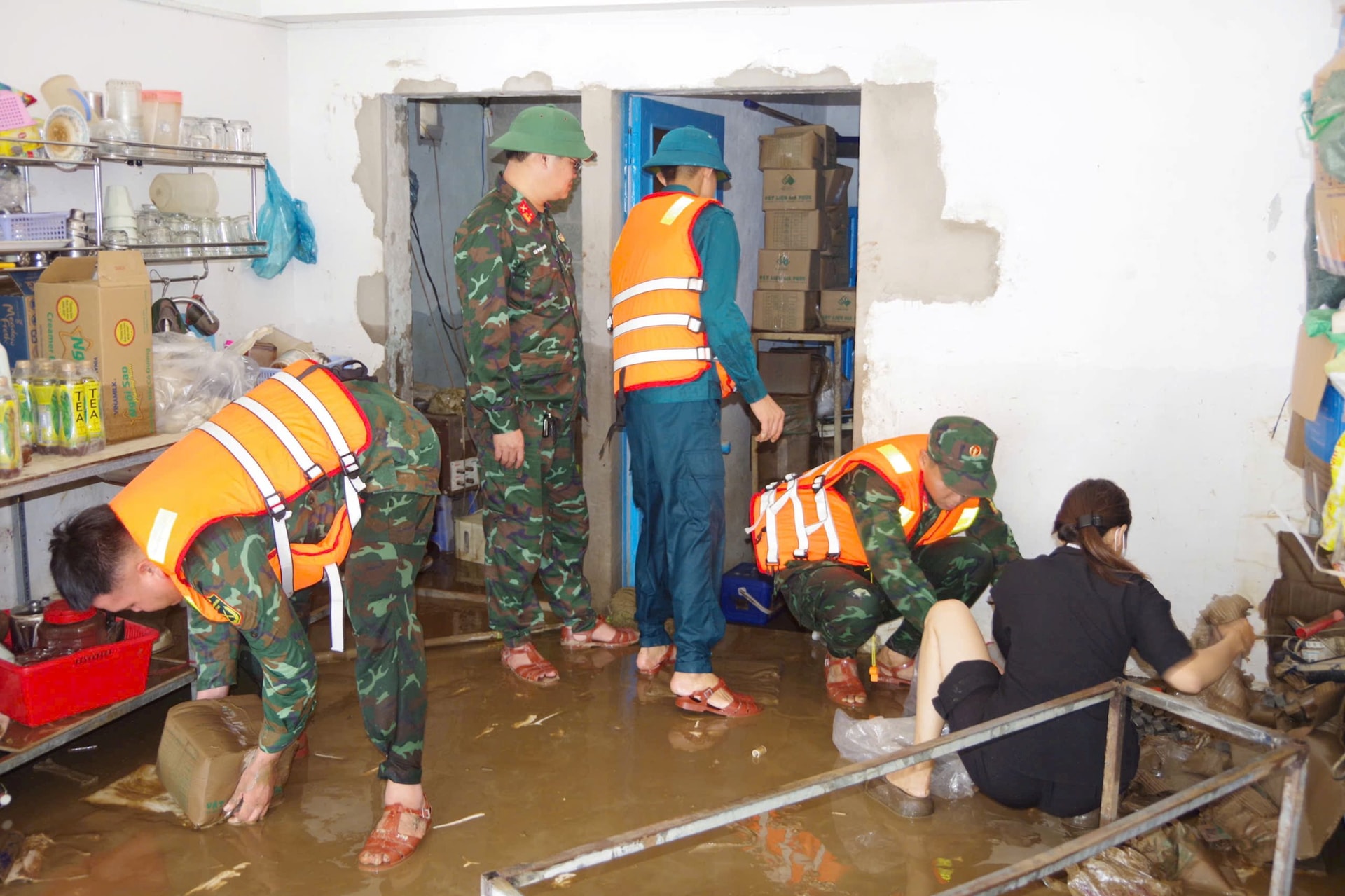 Cán bộ, chiến sỹ Ban Chỉ huy Phòng thủ Khu vực 5 - Phan Thiết giúp người dân dọn dẹp sau khi lũ rút ở phường Hàm Thắng