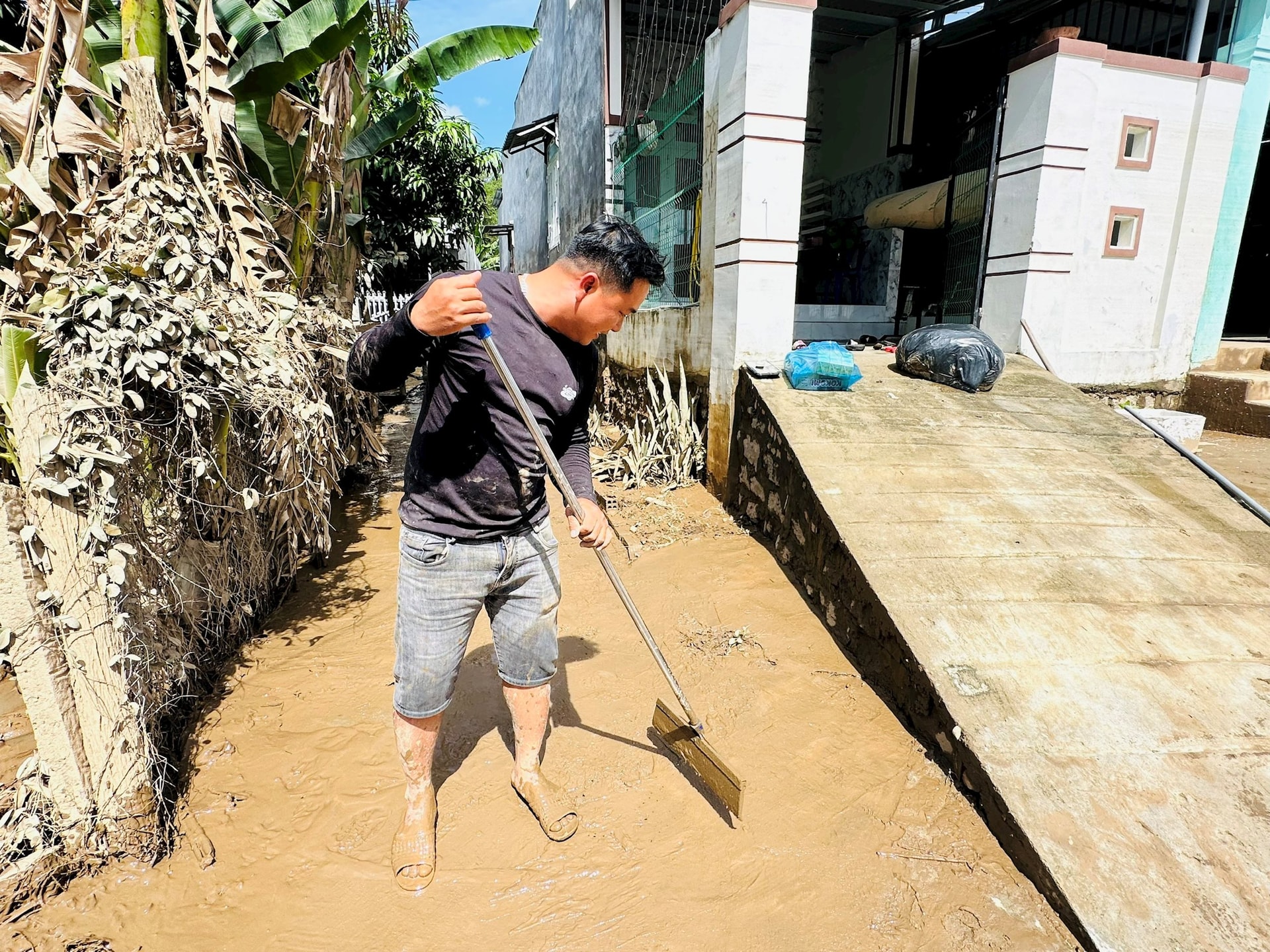 Anh Mai Tùng Châu (xã Bắc Bình) có nhà ven Sông Lũy, bị ngập nặng. Sau khi nước lũ rút vào ngày 5/12, gia đình tập trung dọn dẹp bùn đất