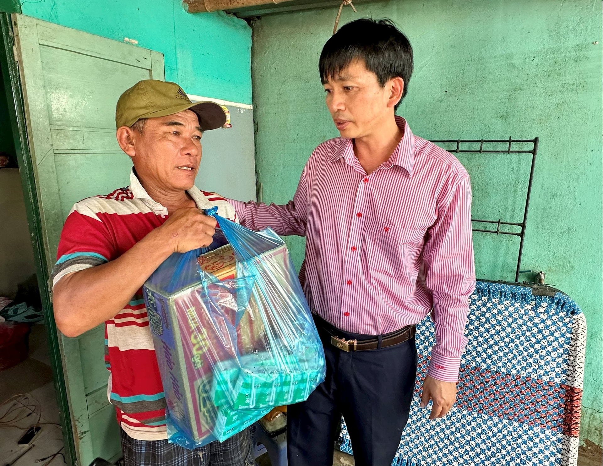 Ông Nguyễn Thúc Phước Hải, Chủ tịch UBND xã Bắc Bình trao quà hỗ trợ đến hộ dân bị ảnh hưởng mưa lũ tại khu phố Xuân An 1