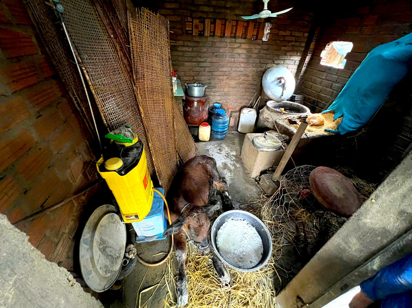 Con bê bị gãy chân được vợ chồng chị Anh đưa vào căn bếp làm bánh tráng cho ấm, chữa trị.