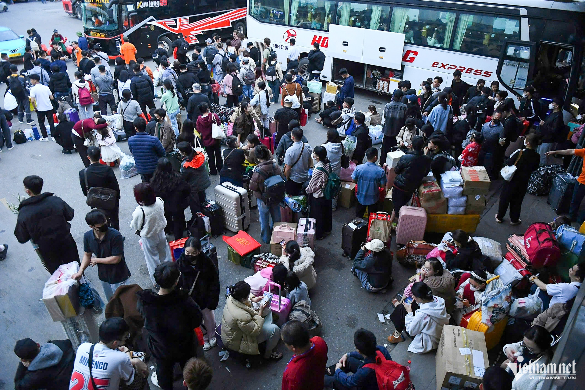Tại khu vực bến xe Mỹ Đình và Giáp Bát, cảnh đông đúc xuất hiện từ đầu giờ chiều. Nhiều hành khách tay xách nách mang quà Tết, vali, thùng xốp…