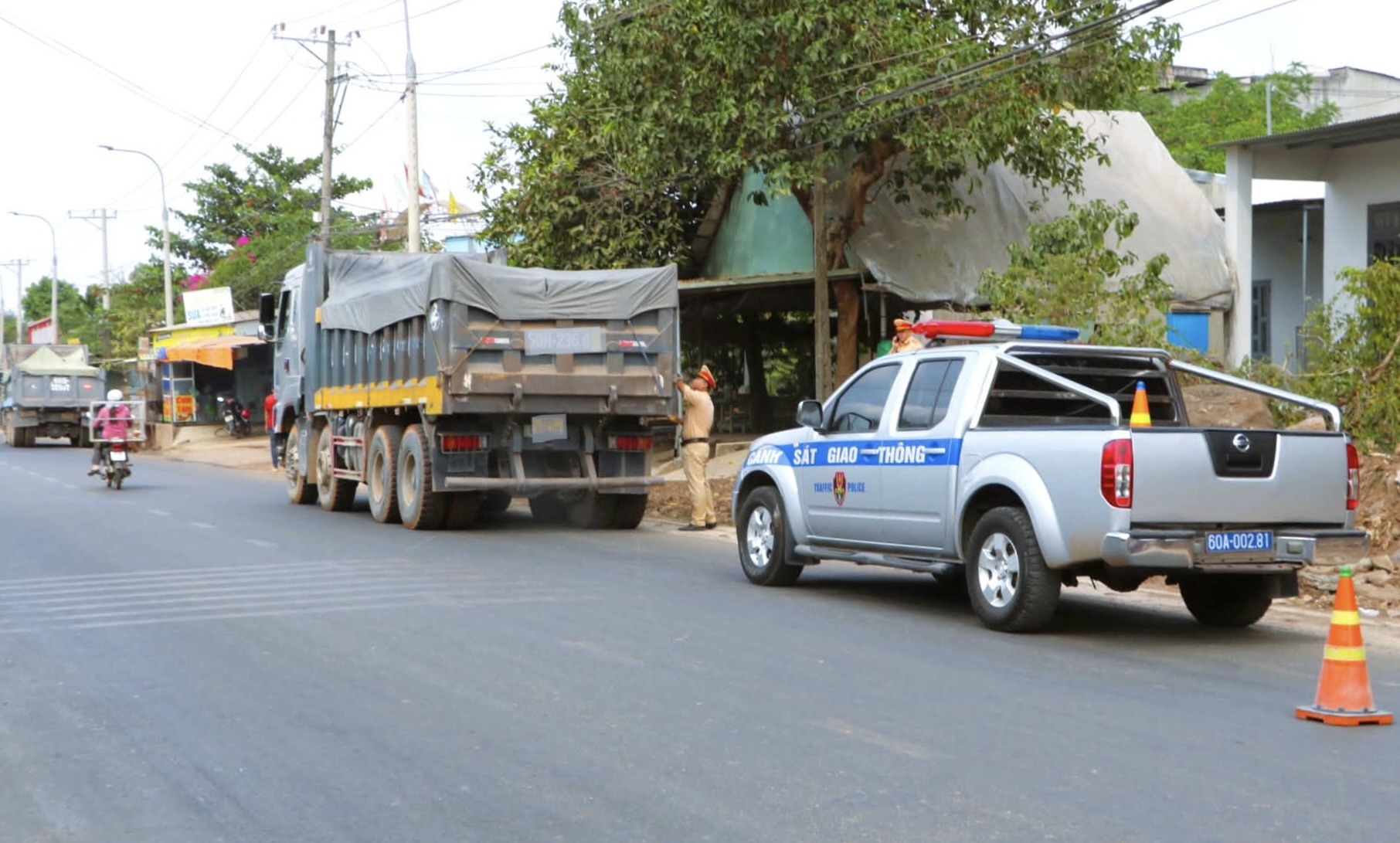 “Tuyến đường có lưu lượng xe tải lớn, chủ yếu phục vụ các công trình xây dựng. Đặc biệt nhiều phương tiện vận tải phục vụ các dự án lớn, trong đó có khoảng 65 xe tải hoạt động phục vụ dự án Nghĩa trang An Viên. Lực lượng CSGT duy trì kiểm tra liên tục, tập trung vào các phương tiện có dấu hiệu vi phạm để kịp thời phát hiện, xử lý.