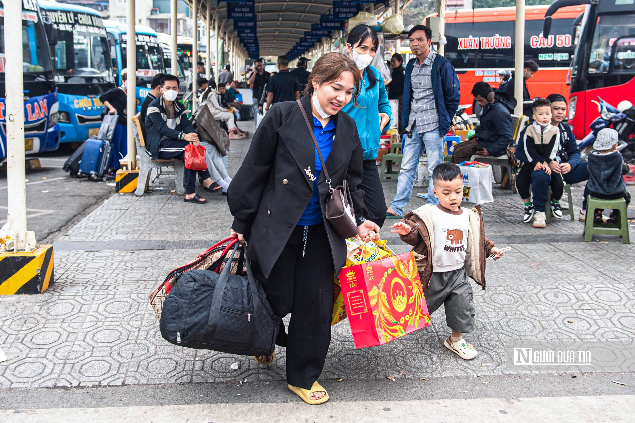 Tại các bến xe Mỹ Đình, Giáp Bát, lượng hành khách đi các tuyến liên tỉnh tăng nhanh so với những ngày trước đó. Nhiều người cũng mang theo túi quà, vali cỡ lớn, lỉnh kỉnh đồ đạc chuẩn bị cho kỳ nghỉ dài.