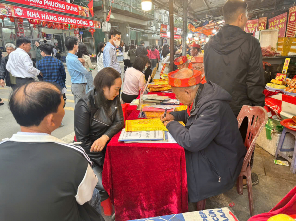 Du khách tìm đến dịch vụ viết sớ bên cổng Phủ để dâng cùng hoa và lễ vật.