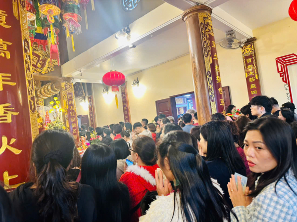 Bên trong Phủ Tây Hồ, người dân chen chúc nhau làm lễ. Dòng người tay cầm hương hoa, lễ vật kéo dài từ cổng vào chính điện.