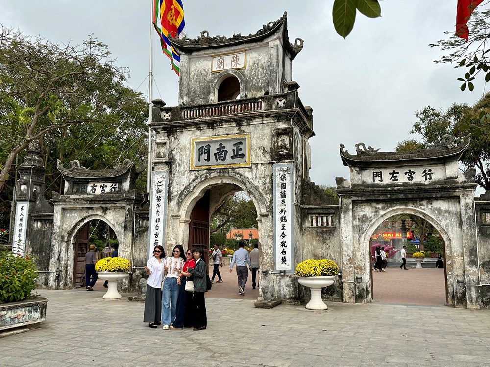 Du khách chụp ảnh lưu niệm trước đền Trần ngày Khai hội