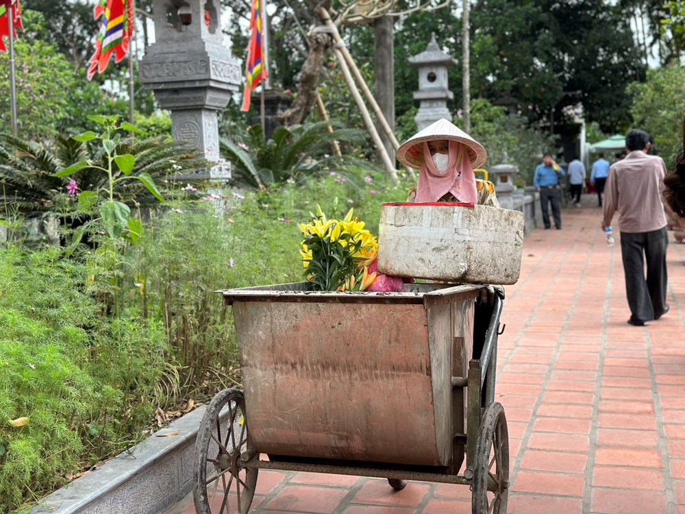 Trong khuôn viên Khu di tích đền Trần, các cô lao công, vệ sinh môi trường miệt mài thu gom rác thải, đảm bảo vệ sinh môi trường, mỹ quan trong ngày Khai ấn
