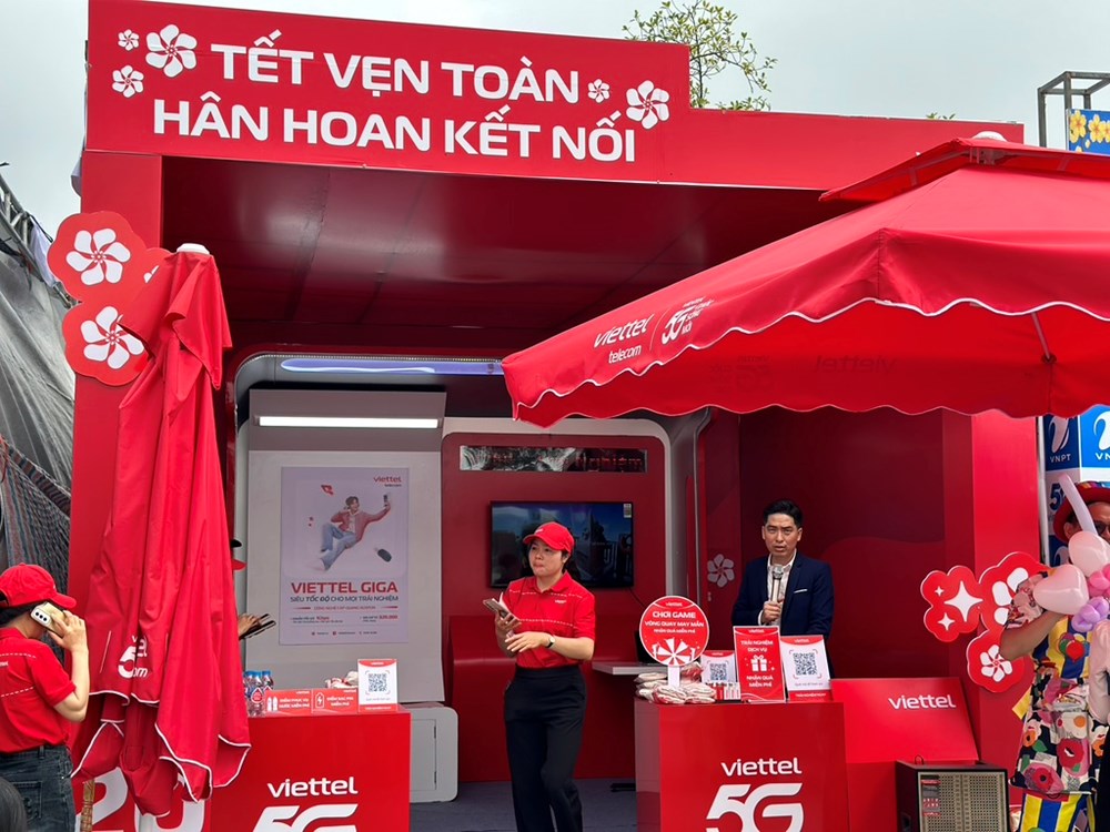 Gian hàng của Viettel ngay cạnh cổng vào đền Trần nơi du khách sạc pin điện thoại, laptop và trải nghiệm dịch vụ miễn phí