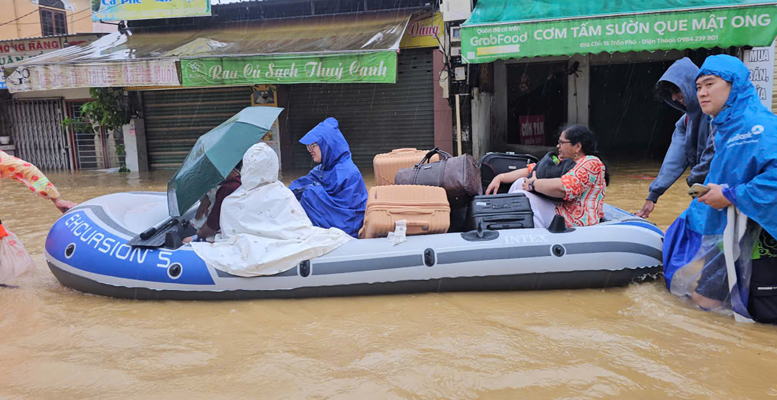 Du khách lưu trú ở khu vực ngập lụt được di chuyển lên đường Trần Phú, khu vực cao ráo nhất TP Huế để tránh lũ, chiều 28-10. Ảnh: VĂN THẮNG
