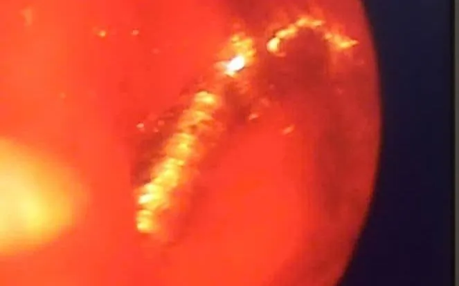 Qua thăm khám, bác sĩ nghi ngờ bệnh nhân bị hóc dị vật ở thực quản và chỉ định nội soi tiêu hóa cấp cứu. Hình ảnh nội soi cho thấy một chiếc đinh vít dài cắm vào thành thực quản, gây phù nề và chảy máu nhẹ.