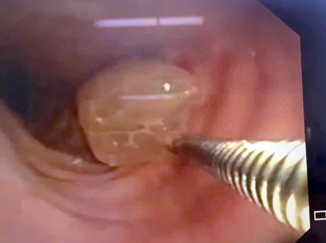 Hình ảnh nội soi thấy được dị vật làm nghẽn đường thở.
