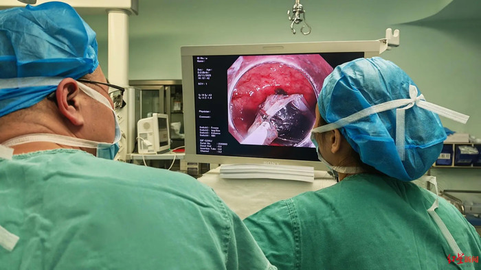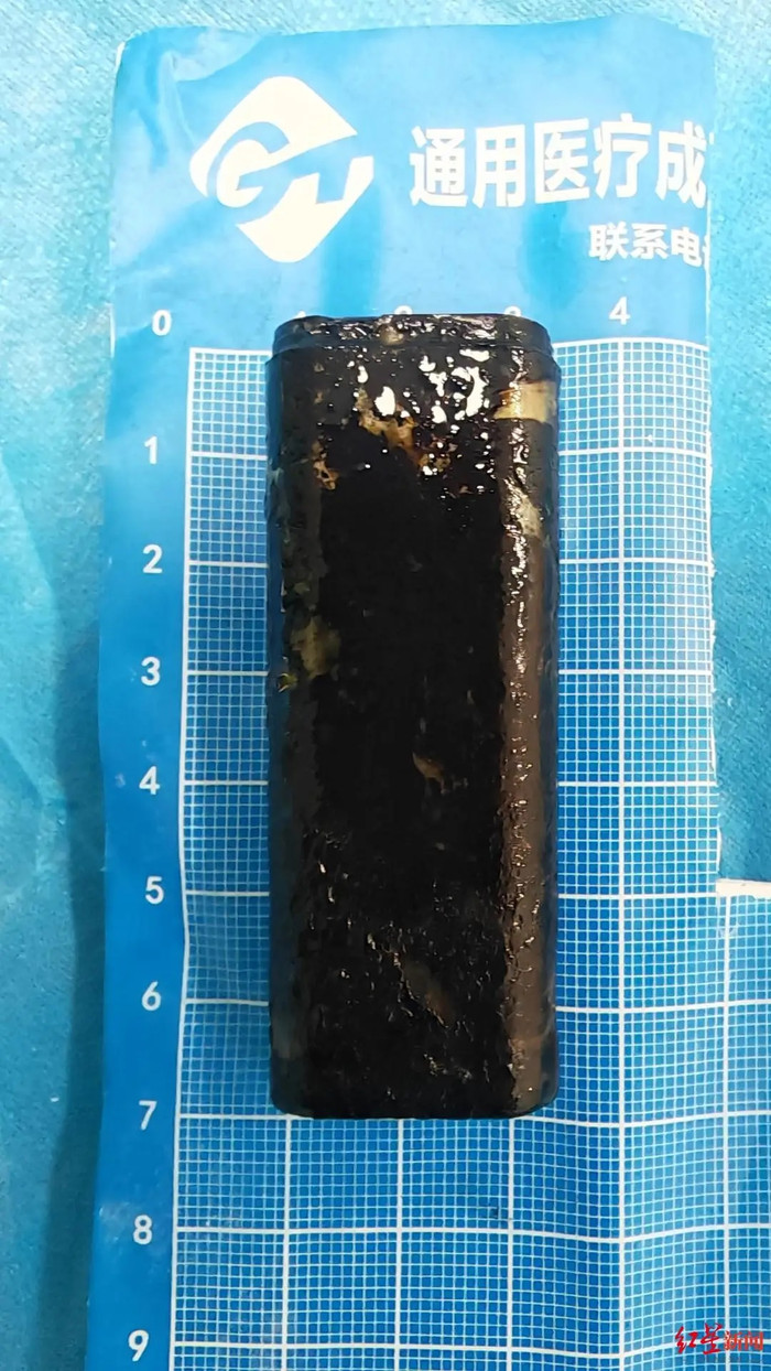 Khi nội soi kiểm tra, ekip bác sĩ phát hiện trong dạ dày bệnh nhân có một vật thể hình hộp dài, màu đen, bề mặt trơn nhẵn. Dụng cụ gắp dị vật liên tục trượt khỏi vật thể khiến bác sĩ buộc phải tạm dừng và đợi bệnh nhân tỉnh lại để truy hỏi nguyên nhân.