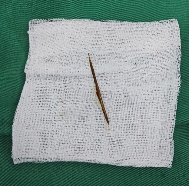 Bệnh nhân được phẫu thuật cấp cứu, lấy dị vật và khâu lỗ thủng. Nhờ can thiệp kịp thời, người bệnh hồi phục tốt và xuất viện sau 9 ngày.