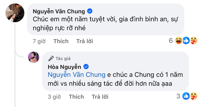 Không lâu sau đó, Hòa Minzy cũng đích thân phản hồi lại: “Em chúc anh Chung có 1 năm mới với nhiều sáng tác để đời hơn nữa ạ”. Màn đối đáp thân thiết, gần gũi giữa hai nghệ sĩ khiến nhiều khán giả thích thú, bởi phía sau đó không chỉ là lời chúc đầu xuân thông thường, mà còn là sự ghi nhận dành cho một mối quan hệ nghề nghiệp đặc biệt.