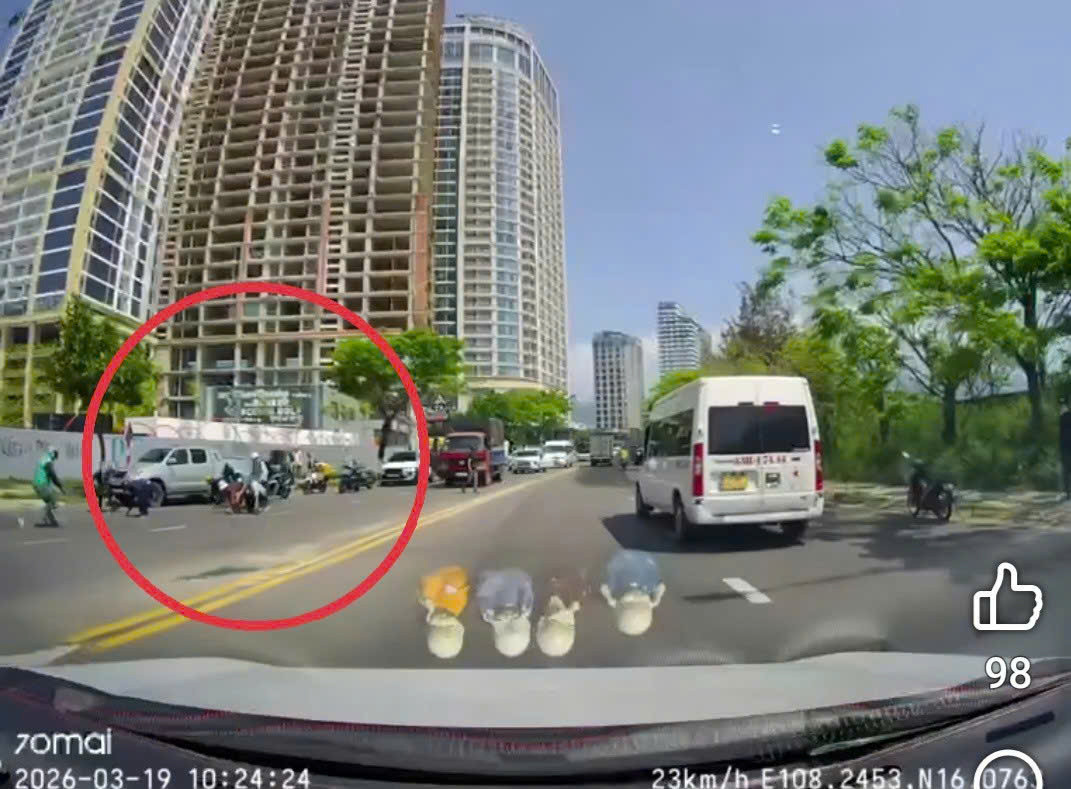 Trước đó, gần 10h30 cùng ngày, camera từ một ô tô ghi lại cảnh nhiều người đi đường bất ngờ dừng xe, chạy ra giữa đường Võ Nguyên Giáp để nhặt tiền do một người dân làm rơi.