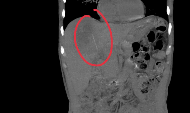 Các bác sĩ không khỏi bất ngờ khi phát hiện một dị vật dạng que, dài khoảng 6–7 cm, nằm hoàn toàn trong nhu mô gan, kèm theo ổ nhiễm trùng sâu.