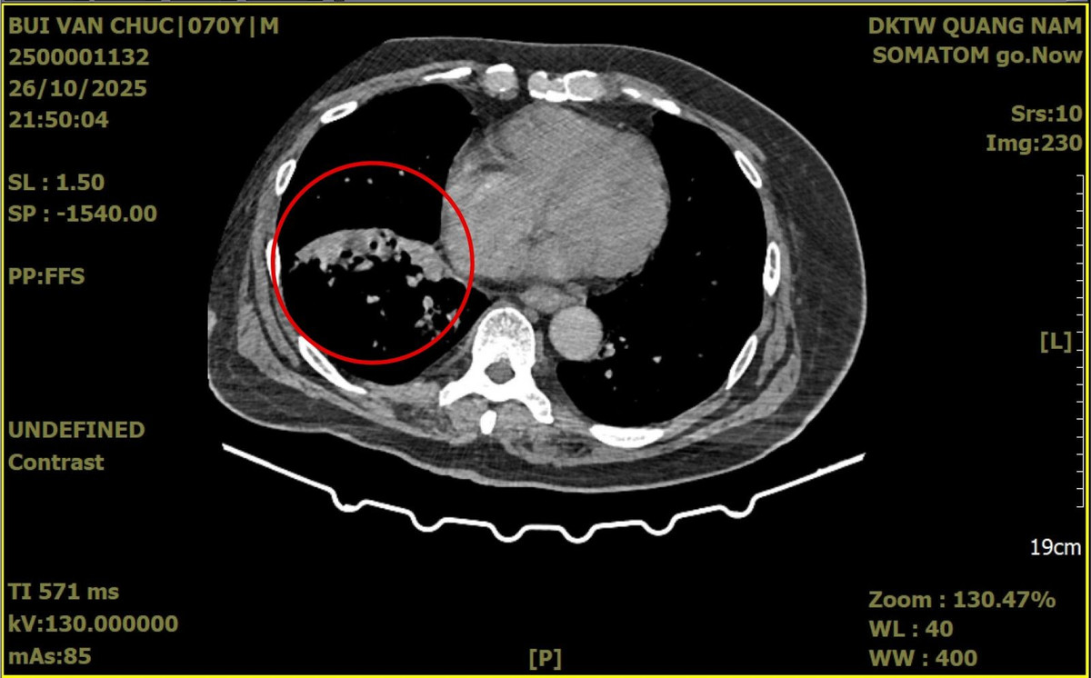 Bệnh nhân là ông Bùi Văn Ch. (70 tuổi, trú tại xã Núi Thành, TP Đà Nẵng) được người nhà đưa đến bệnh viện vào đêm 26/10 trong tình trạng hôn mê, khó thở, ho ra máu nhiều, gây suy hô hấp nặng. Kết quả đo cho thấy nồng độ oxy trong máu động mạch (SpO₂) chỉ còn 65%.