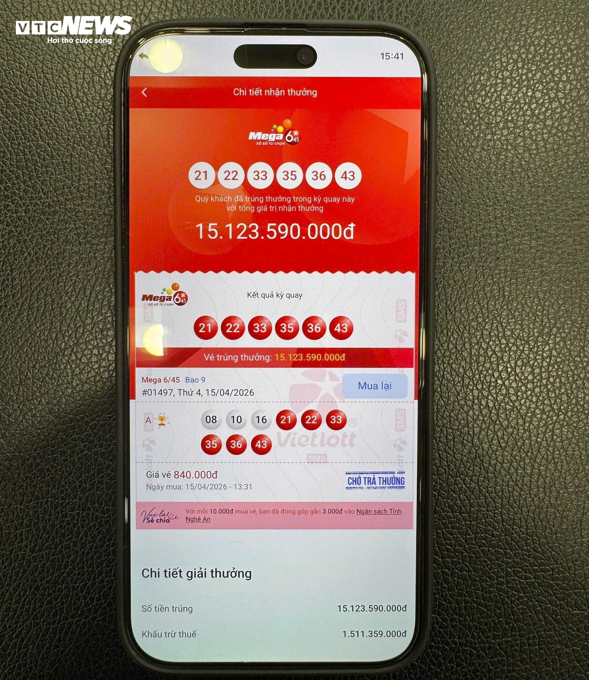 Ngày 23/4, Công ty Xổ số Điện toán Việt Nam (Vietlott) cho biết vừa trao giải Jackpot sản phẩm Mega 6/45 kỳ quay 1.497 trị giá hơn 15 tỷ đồng cho anh H.Q (quê Nghệ An).
