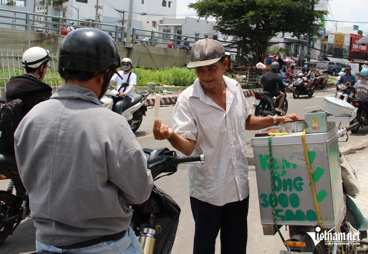 Trước đây, mỗi ngày ông bán gần 2 thùng, hơn 400 cây. Nay chỉ bán chưa đầy nửa thùng, nhưng ông vẫn kiên trì dắt xe đi bán với tinh thần lạc quan, yêu đời.