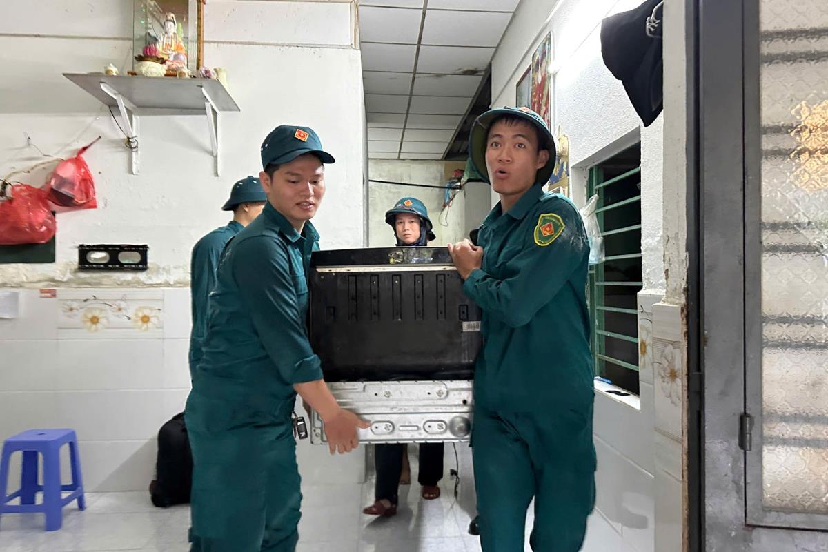Lực lượng dân quân, dân phòng phường Hòa Khánh hỗ trợ nhân dân kê dọn đồ đạc, tránh hư hỏng do ngập úng.