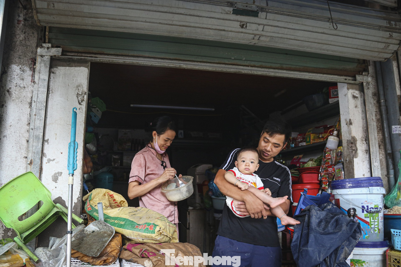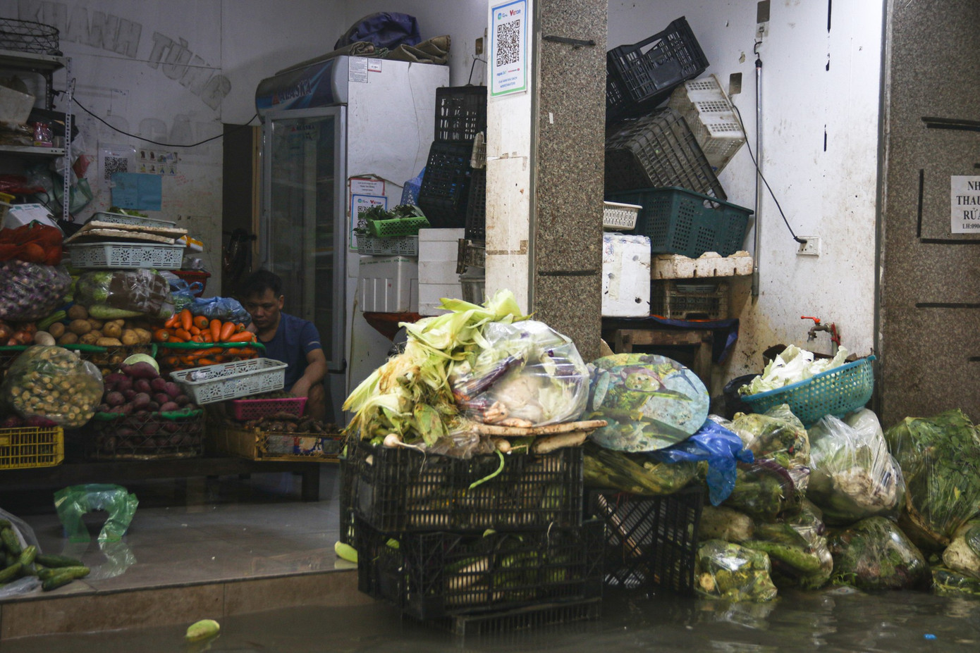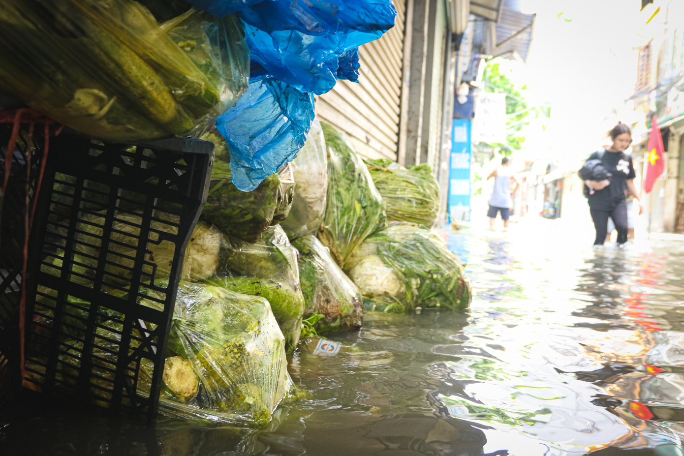 Vốn là con ngõ chuyên kinh doanh, buôn bán thực phẩm, không khó để bắt gặp cảnh rau củ, bánh mì,... chất đống khắp vỉa hè ngập nước tại đây.