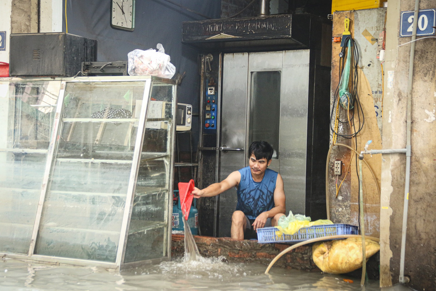 Máy bơm chạy quá công suất đã hỏng, ông Quyền (tổ dân phố số 2 Phú Đô) cùng vợ người tát nước thủ công, người đẩy nước từ sâu trong cửa hàng bánh mì ra ngoài.