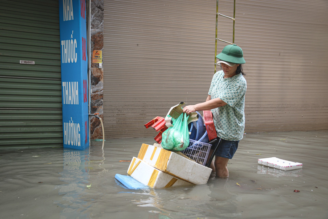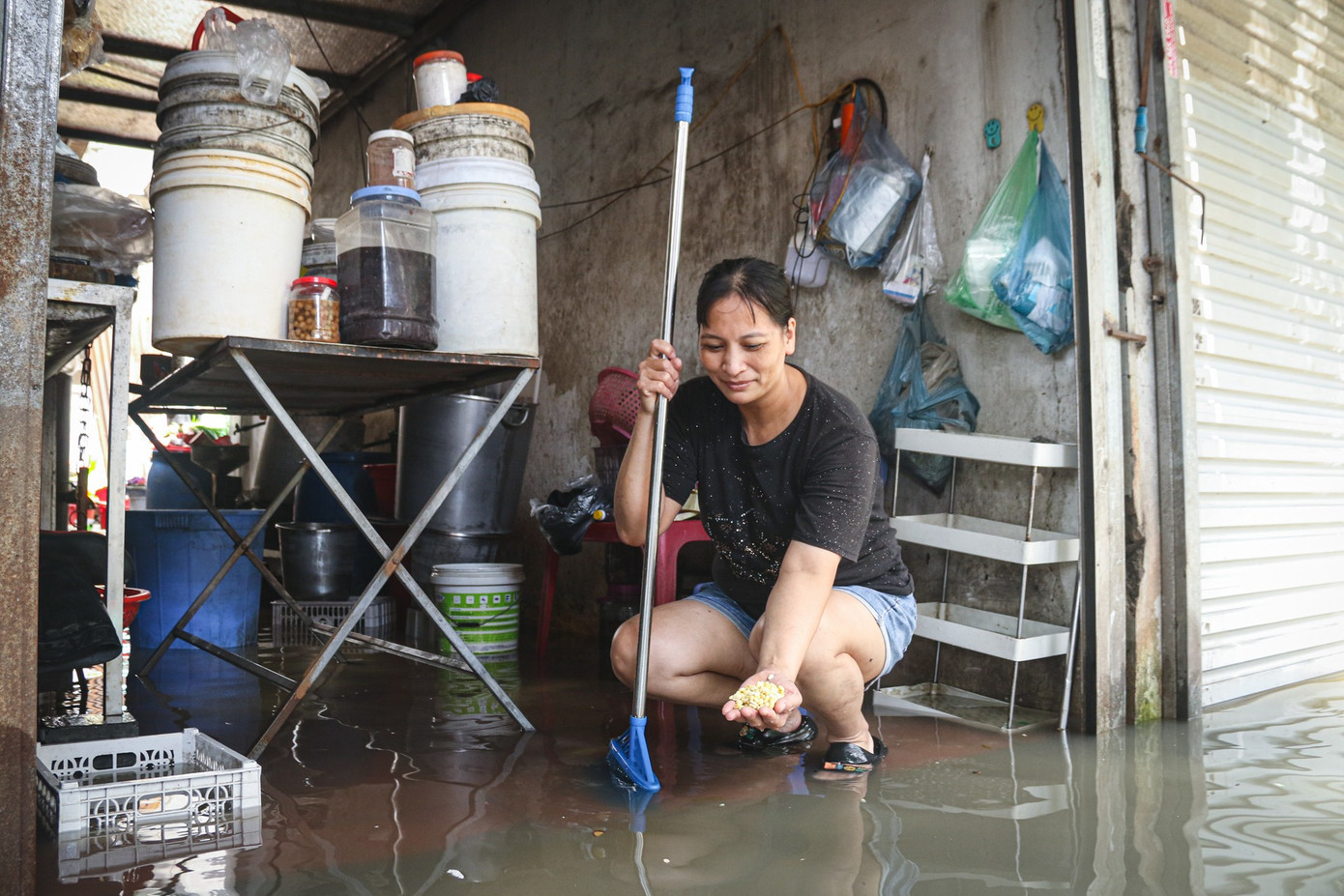 Ông Minh (tổ dân phố số 2 Phú Đô) thất thần ngồi nhìn 3 tạ rau củ quả của gia đình thối rữa. "Gia đình vốn kinh doanh bán lẻ thực phẩm hàng chục năm tại đây. Sáng 30 vừa nhập 3 tạ rau củ về chưa kịp bán thì ngập. 2 ngày ngập trong nước bẩn, tôi đành phải bỏ chất đống ngoài cửa, chờ nước rút đem vứt bỏ, thiệt hại hơn 10 triệu đồng", ông Minh ngậm ngùi chia sẻ.