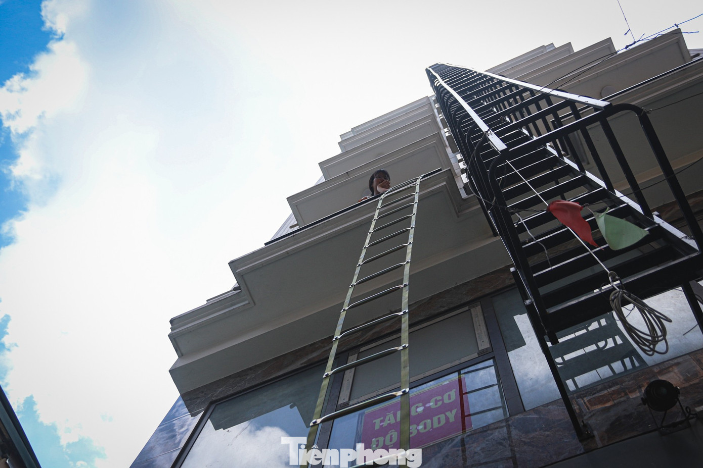 "Cửa cuốn không thể mở hai ngày nay. May mắn là trong nhà có thang thoát hiểm để trèo xuống mặt đất. Căn nhà này có gần chục phòng trọ cho thuê, hàng chục người đều phải trông chờ vào chiếc thang này để ra ngoài mua đồ ăn thức uống", anh Việt kể.