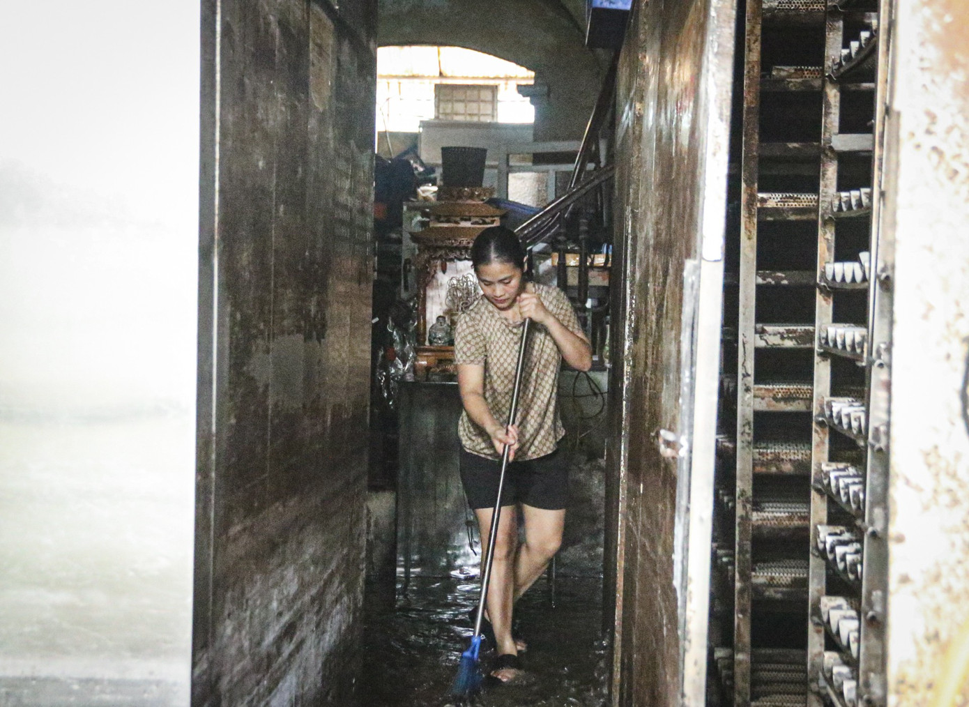 "Hôm qua nước ngập tới cổ, ngang thân lò nước làm máy móc hỏng hết cả. Nhà ngập ngang cầu thang lên tầng 2, đến ban thờ thần tài gia đình phải đưa lên chỗ cao cũng không tránh khỏi ngập nước", ông Quyền buồn rầu kể lại.