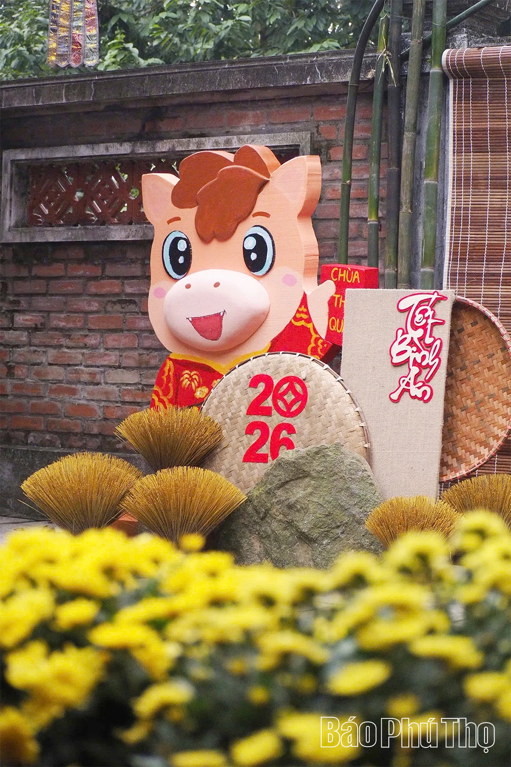 Linh vật ngựa Tết Bính Ngọ 2026 tượng trưng cho sự bứt phá, tinh thần kiên cường và khát vọng vươn lên được đặt trang trọng trong khuôn viên Chùa Thiên Quang, Khu Di tích lịch sử Quốc gia đặc biệt Đền Hùng (xã Hy Cương).