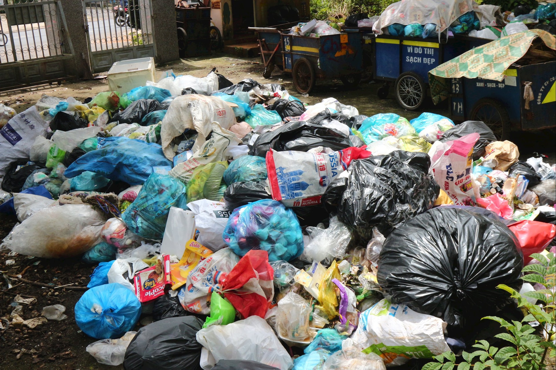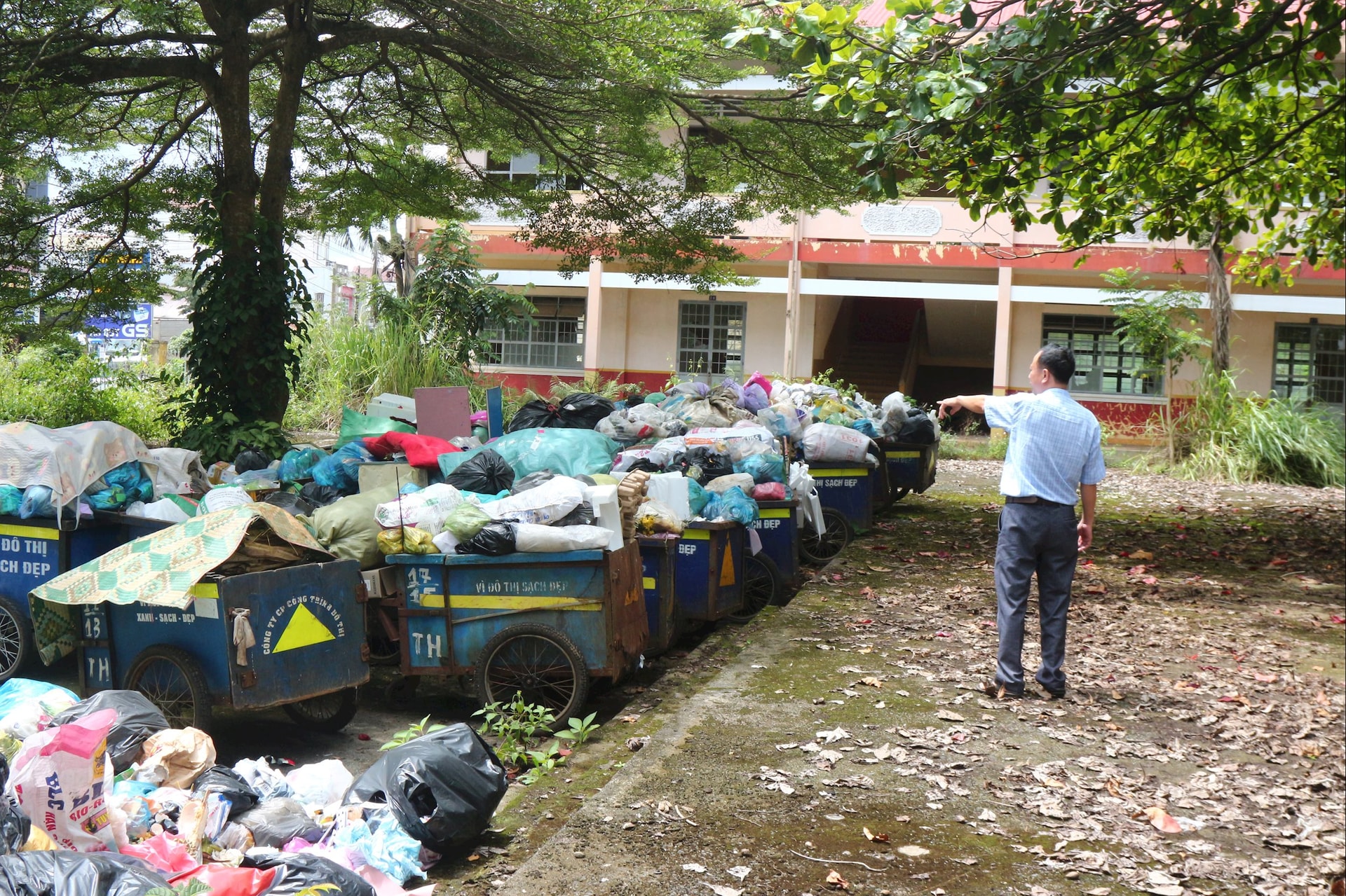 Theo đó, nhiều xe rác và các túi nilon đựng rác đang được tập kết ngay tại Trường Tiểu học Lộc Sơn 1 (hiện bỏ hoang).