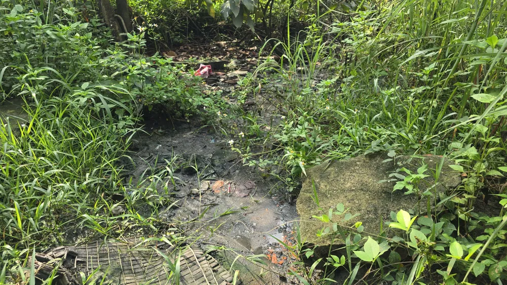 Nước thải từ bãi tập kết rác tràn ra ngoài bốc mùi hôi thối.
