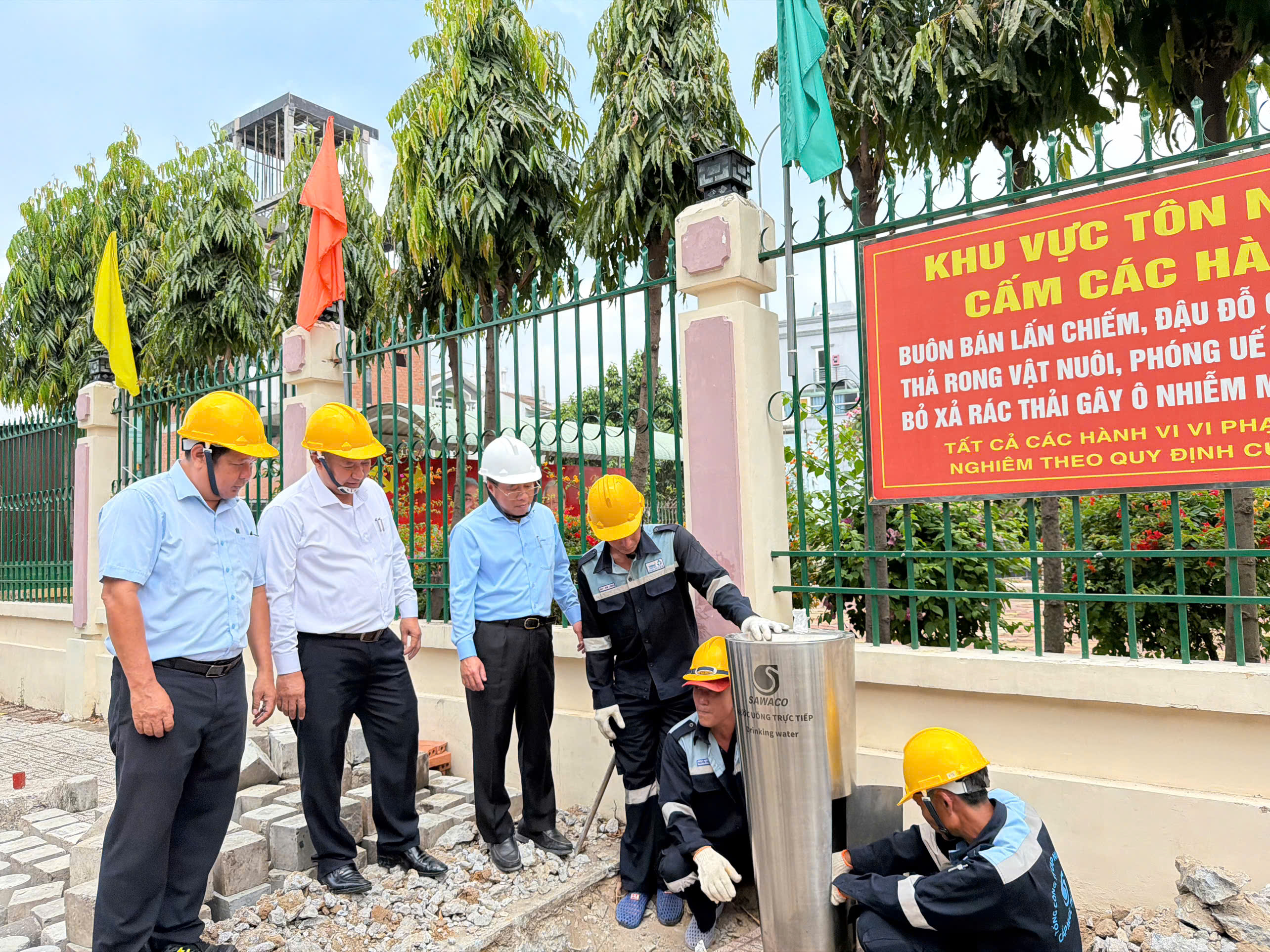 Ông Dương Hồng Nhân - Chủ tịch Hội đồng thành viên SAWACO đã có mặt từ sớm để chỉ đạo các công nhân trong quá trình thi công trụ nước uống công cộng.