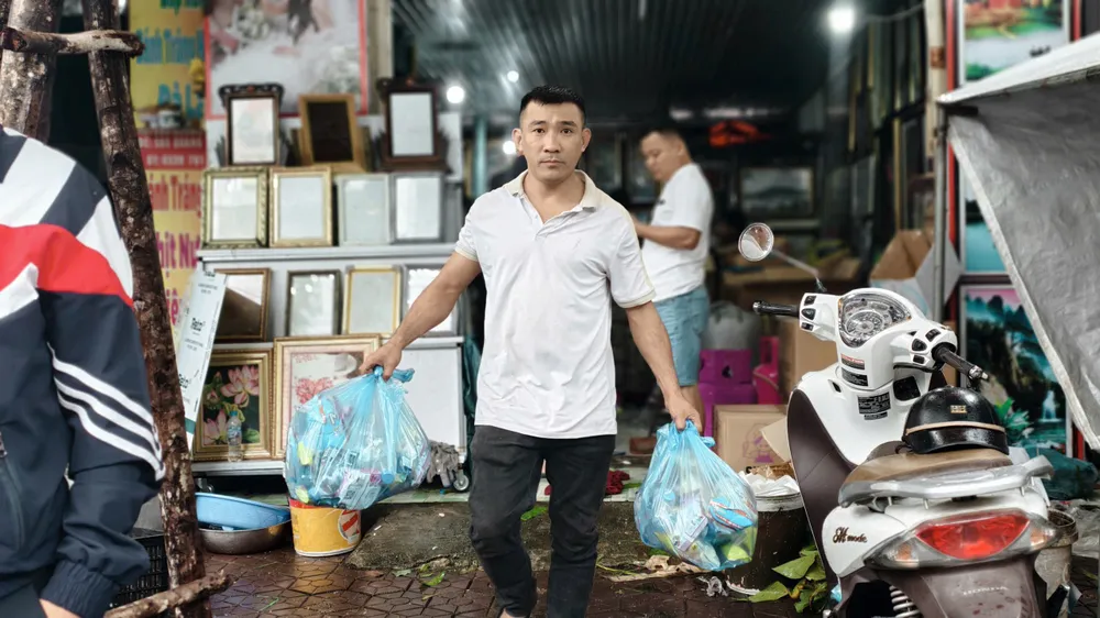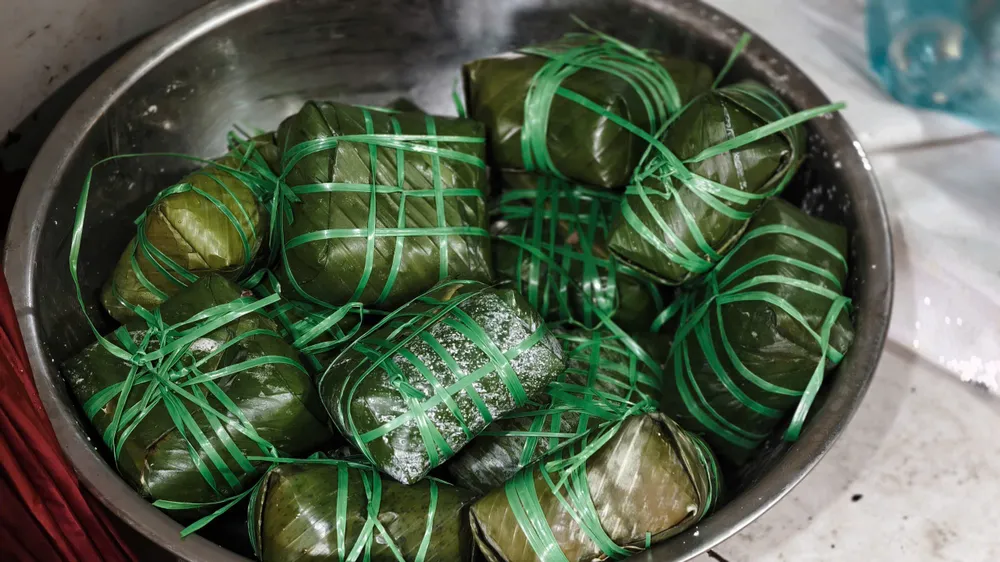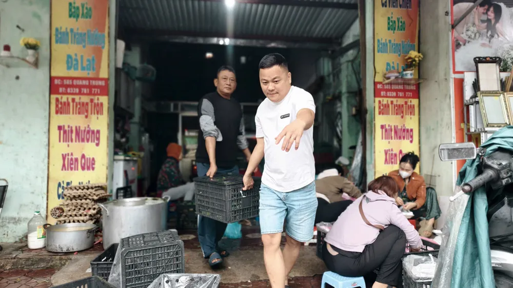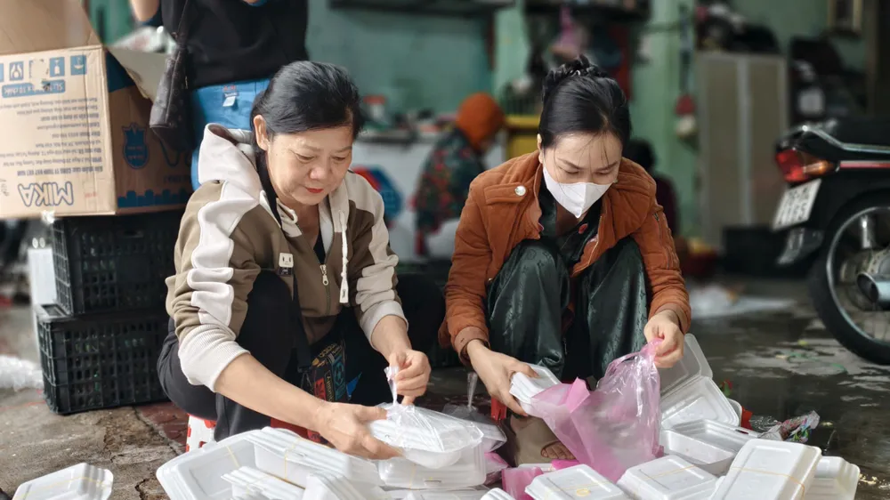 Không chỉ có thực phẩm nhanh, từ chiều hôm trước, bà con đã tụ họp tại 587 Quang Trung để gói bánh chưng, bánh tét gửi lên vùng lũ. Người lau lá, người vo nếp, người làm nhân, người buộc lạt… tất cả đều hối hả, đầy sự ấm áp, tinh thần sẻ chia. Chỉ trong một đêm, 5 nồi bánh lớn với hàng trăm cặp bánh đã được vớt ra, để ráo rồi chuyển ngay vào vùng đang ngập sâu.