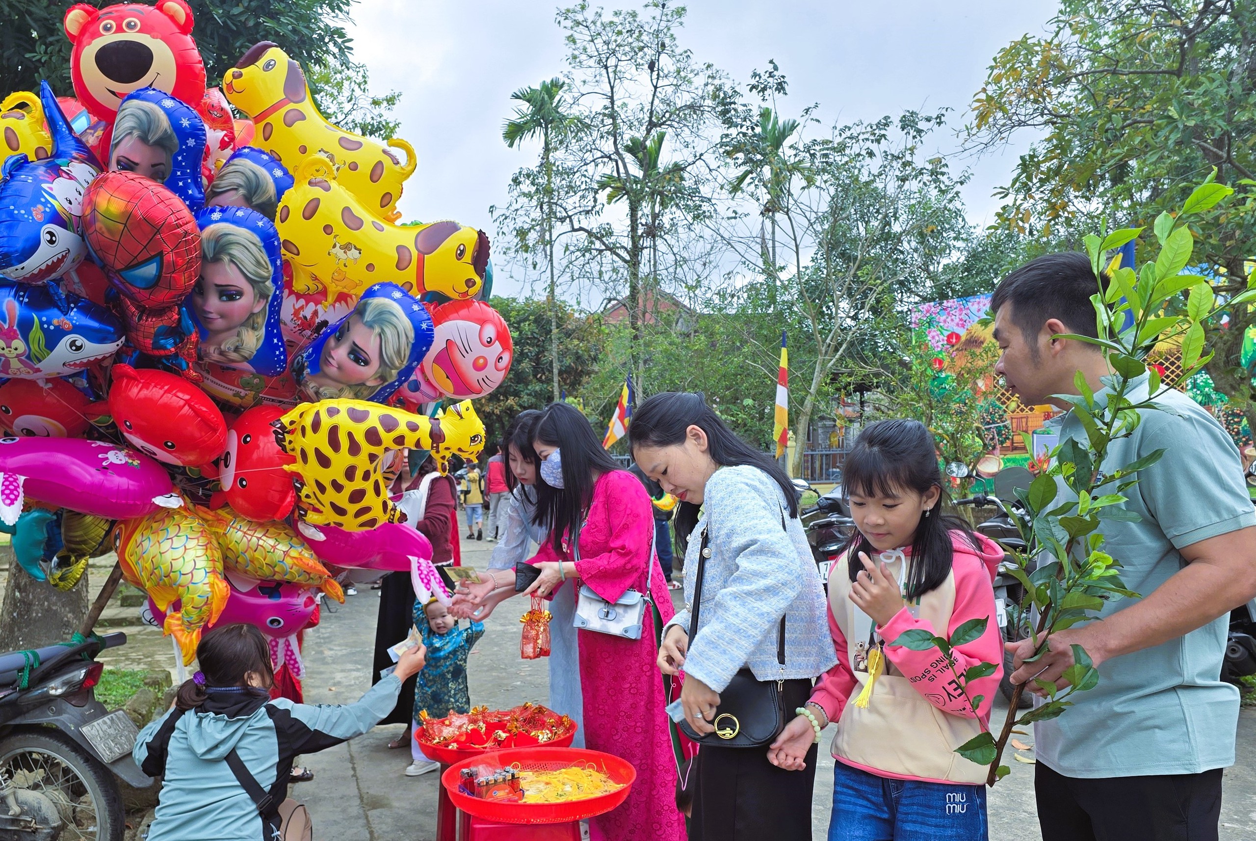 Sau khi đi lễ chùa sáng mùng 1 Tết, nhiều người tranh thủ dừng chân để mang về nhà cành "lộc", bịch muối hạt… cùng ước nguyện bình an, may mắn trong năm mới.